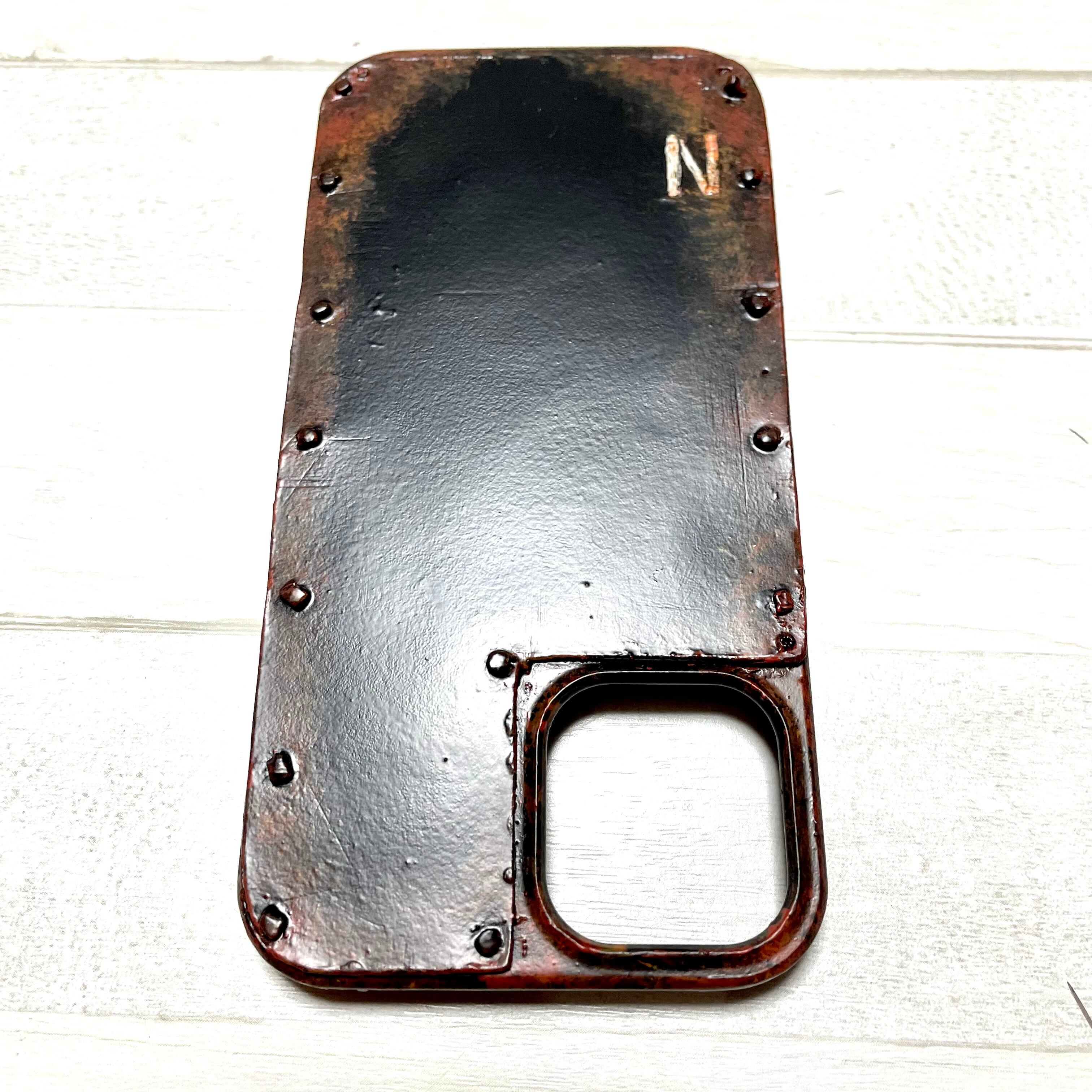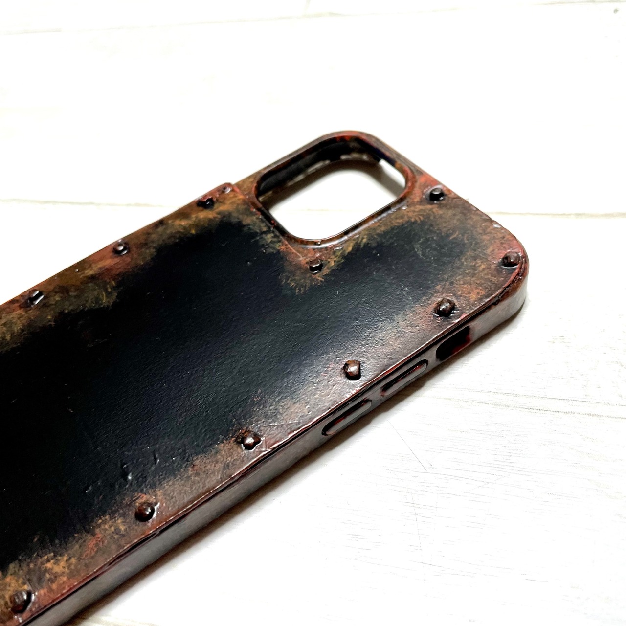 サビ塗装がかっこいいダークパンクな雰囲気の、ハンドメイドで作られたスマホケースです。