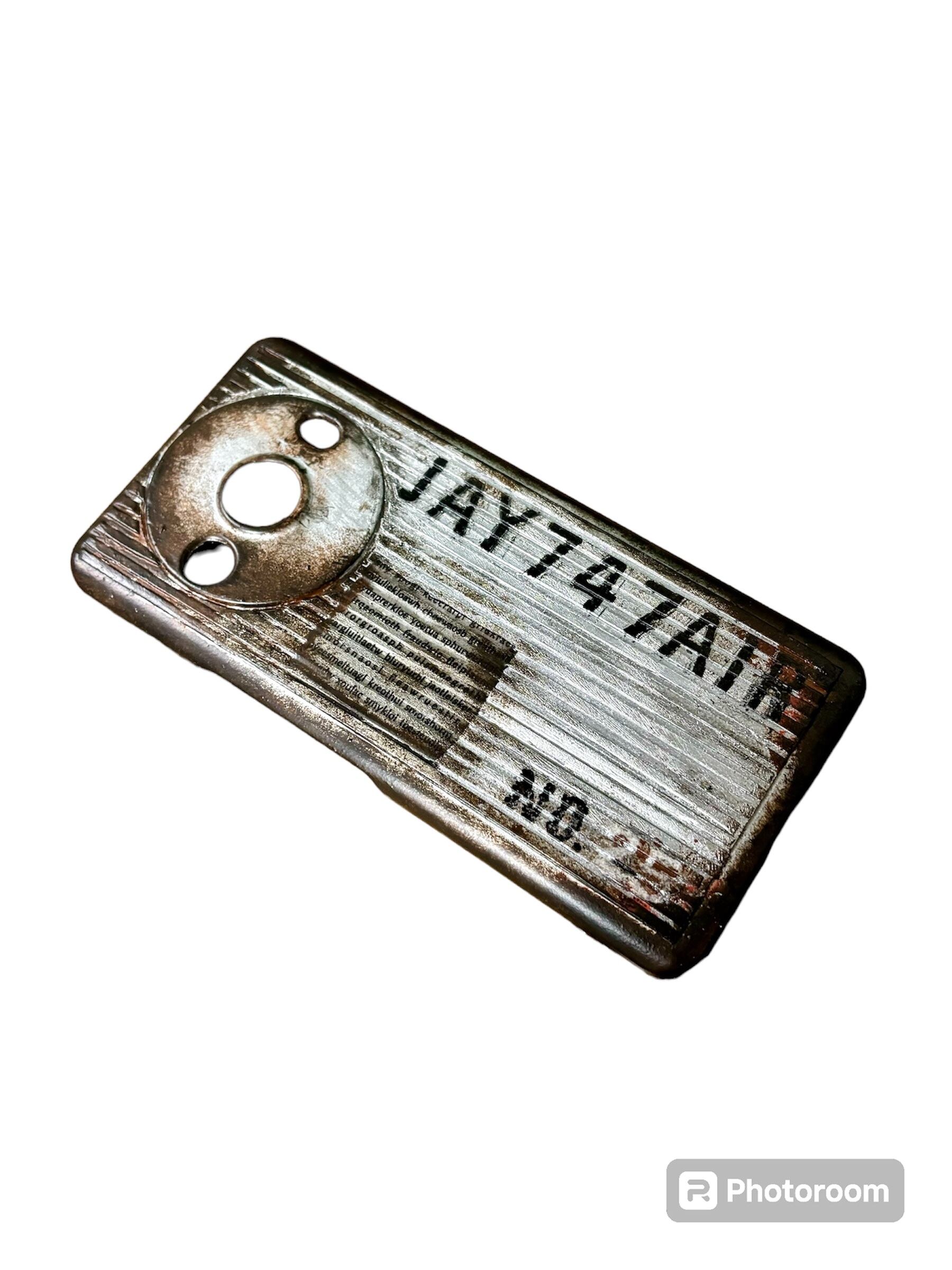 市販のスマホケースに下地処理し下塗り、中塗りをして、文字プリント加工、さらにエイジング加工を施してサビ塗装、艶消しコーティングでヴィンテージ感をリアルに表現しました。